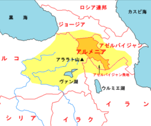 上の写真はアルメニアの首都エレバンです。遠くの山、アララト山は『旧約聖書』の創世記のなかでノアの方舟の漂着地とされる山です。悪で満ちた地上が大洪水で罰されたときに神に選ばれたノアとその家族たちが箱船で送られてきたという山です。そして、アルメニア人の父祖はノアの血を引くとされています。