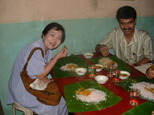 カリカットに到着して、私達はまず3星のホテルに滞在することにしました。シャワーはなく、大きなバケツに水を貯めて手桶で水を掛けるものでした。大きな音がするエアコンでしたが幸いにも備わっていて室内は快適でした。ホテルから外に出るといっぺんに汗が吹き出てくるほど40度をこえそうな猛暑です。長期滞在なのでまず机と椅子を2つお願いすると,すぐに小学生用のものを持ってきてくださいました。朝、晩の食事はホテルの食堂でしますが、その美味しさは格別なのです。このホテルの食堂は美味しさでは有名らしく夜は客で一杯になっていました。私は特にバターナンが好物で毎回お願いしました。カレーが主なメニューですが色々な種類があり、二人共カレーは大好きなので飽きることはありませんでした。しかし、カロリーが多いので私は超肥満になってしまいました。