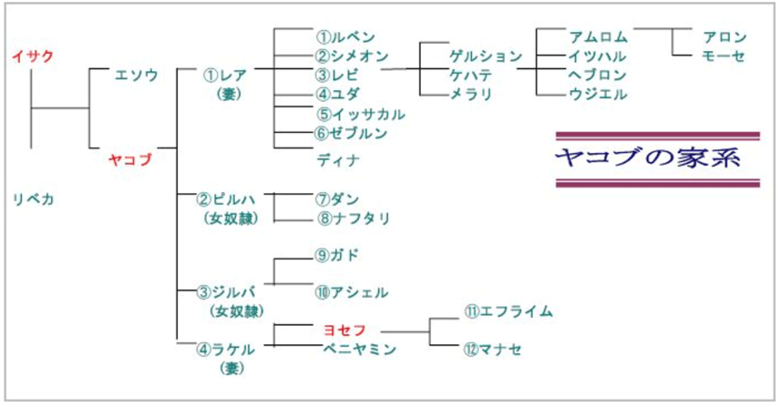 なるほど、こういうことであれば、リベカは、たとえイサクとエサウを裏切ったとしても、あえてヤコブがイサクから祝福を受けられるように計画をしたのかもしれないね。参考にヤコブの家系図を書いておきましょう。